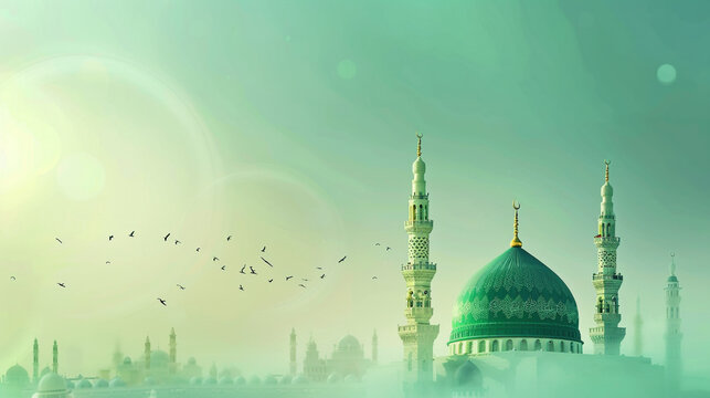 A Poster for a mosque with a green dome and a mosque in the background. Milad un Nabi banner and Islamic background with Mawlid al Nabi celebration poster