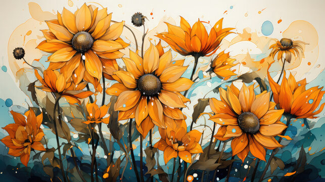 Watercolor sunflowers art, ala prima, painting with spots and splashes, picturesque still life, summer and autumn sunny flowers, poster, background, wallpaper, generative AI