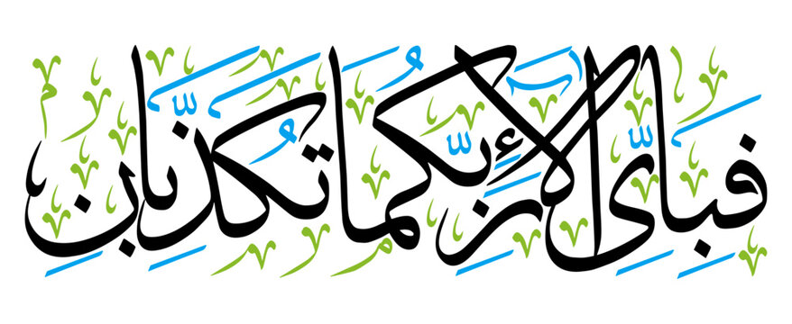 Surah Al-Rahman fabi ayyi ala i rabbikuma tukazziban in arabic text, ayat quranic verses, islamic muslim, calligraphy khattati, color black isolate on the white wallpaper background