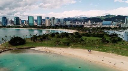 Flying over the lagoon, park and beach of Ala Moana and Magic Island, Hawaii.