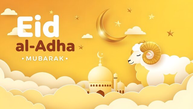 Eid aladha mubarak greeting card with a white ram standing on clouds next to a mosque under a crescent moon and stars