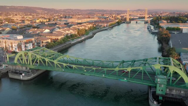 Aerial: Traffic crossing the Park Street Bridge Crossing Tidal Canal. Alameda, USA