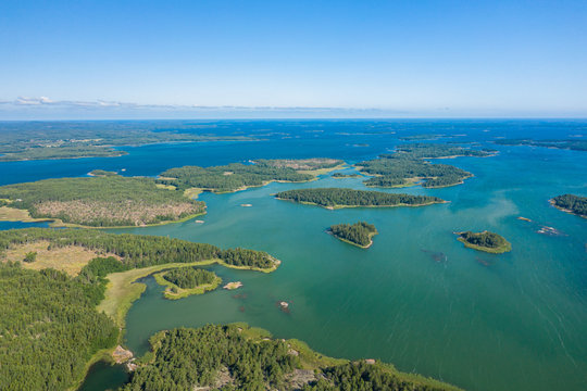 Aerial view of Aland Islands at summer time. Finland. The Archipelago. Photo made by drone from above. Nordic Natural Landscape.