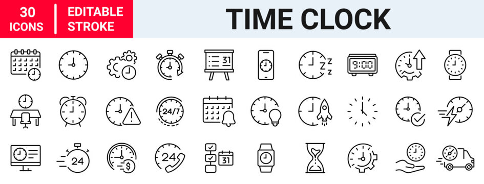 Time and Clock web icons in line style. Calendar, timer, time, stopwatch, countdown, collection. editable. Vector illustration.