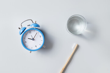 Concept wake up time with clock, water and toothbrush. Morning routine essentials featuring blue alarm clock, toothbrush and glass on gray background