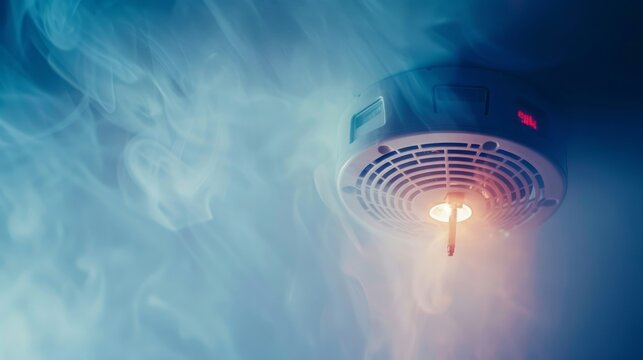 A smoke detector and interlinked fire alarm in action, with a background featuring copy space for additional text or graphics.