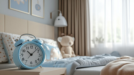 cozy bedroom featuring blue alarm clock, soft bedding, and teddy bear, creating warm and inviting atmosphere. natural light enhances serene environment