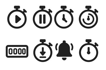 Stopwatch Icon Set. Solid, filled icon set of stopwatch features: start button, pause button, reset button, lap timer, digital display, countdown timer, alarm,