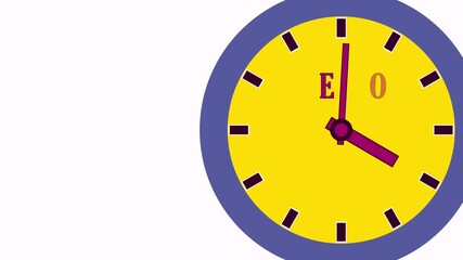 A bright yellow clock with purple edges features the word DEMO. The clock hands are displayed in various positions as time progresses, each second a fleeting moment