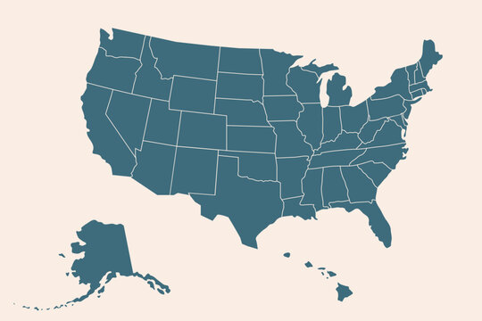 USA map outline vector in black stroke with individual state borders, including Alaska and Hawaii. Clean and minimal map for infographic, education, and geography visuals.