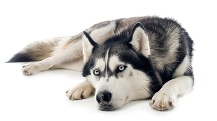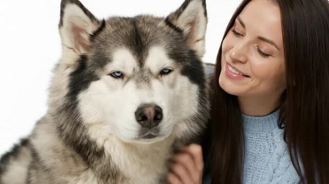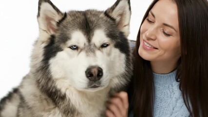 Woman and her alaskan malamute with blue eyes, Portrait of a woman cuddling her dog , Dog and owner in the studio