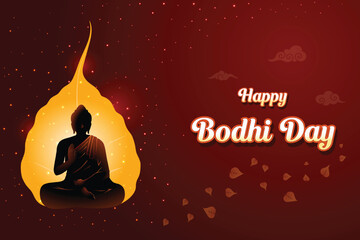 Abstract Buddha's Silhouette On Leaf With Lights Illuminating On Red Background. Concept Design Vector Illustration For Bodhi Day, Buddha Purnima, Vesak, Rohatsu, Makha Bucha Etc.