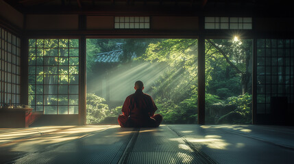 a monk sitting in deep meditation inside a dojo with morning sunlight coming in through the window, surrounded by a serene natural setting, Rohatsu, Ai generated images