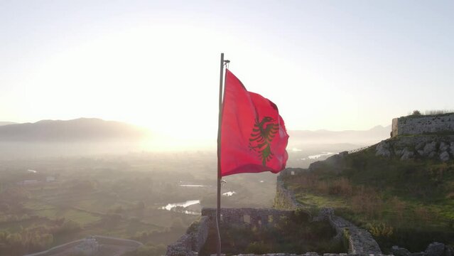Close up shot of albanian flag on top of Schloss Shkodra during sunrise, aerial
