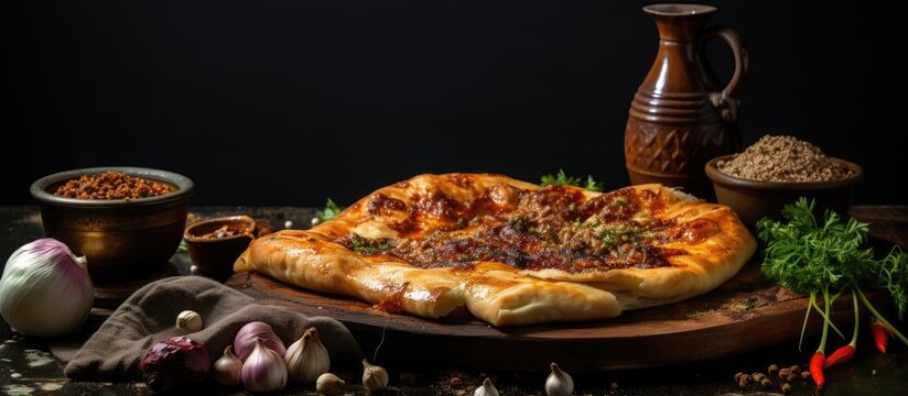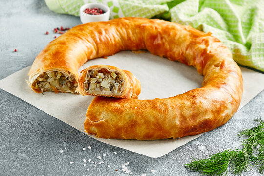 Classic turkish pie with meat and potato on wooden board. Composition with burek pie on concrete background with textile and spices. Balkan pie with meat and potato in rustic style on gray table.