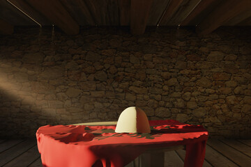 3d rendering of albanian hat and albanian flag laying on wooden table in front of stone wall