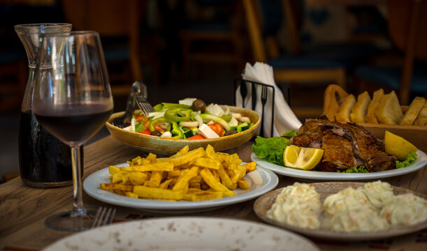 Albanian food in the famous restaurant Mrizi I Zanave in village Fishte, region of Zadrima. Domestic food appetizers and wine.