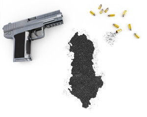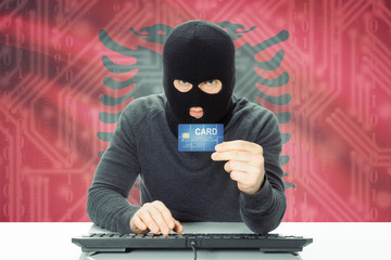 Dark-skinned hacker with flag on background holding credit card - Albania