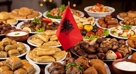 Explore albanian cuisine traditional dishes and flag showcasing culinary heritage feast