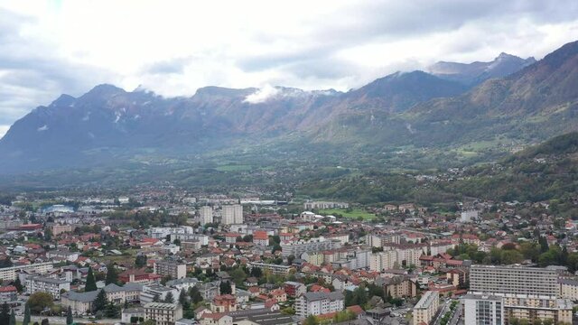 Aerial shot of the pretty old town (Conflans) overlooking Albertville, beautiful view of an old city surrounded by mountains,  View of the Conflans, the medieval city located in upper savoy, France