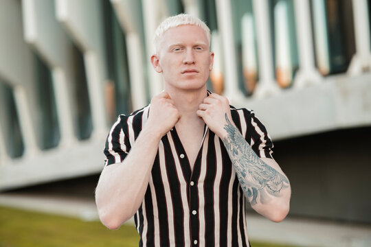 Young albino blond man wearing casual t-shirt standing over isolated blue background looking to side, relax profile pose with natural face with confident smile.