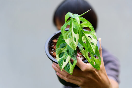 A monstera deliciosa albo plant, have intercourse for its trendy variegated leaves, in a forward-looking pot.