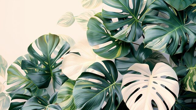 a lot of monstera albo extra white high variegation in the style of a watercolor painting with some half white/green leaves, on a white background