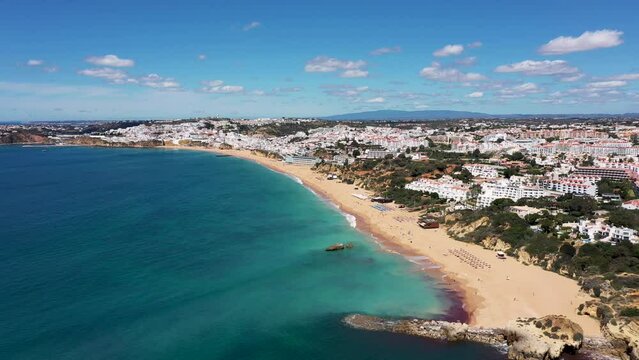 Panoramic aerial view revealing albufeira's stunning coastal landscape, showcasing turquoise waters, sandy beaches, urban architecture nestled along algarve's picturesque shoreline in portugal
