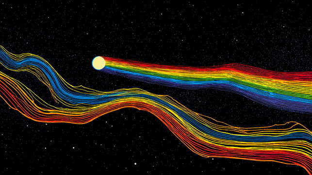 70s-style album cover art featuring long, colorful, wavy rainbow lines in space