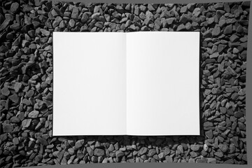 The open album lies on dark gravel. White sheet on stones, free space for your design, mock up