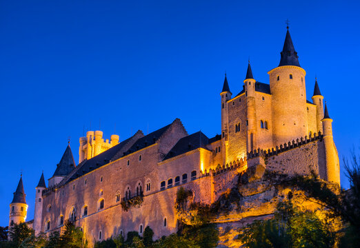 Alcazar of Segovia illuminated at dusk; Segovia, Castile and Leon, Spain
