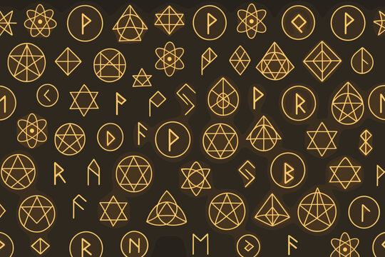 Seamless dark pattern with glowing runic and atomic alchemical symbols