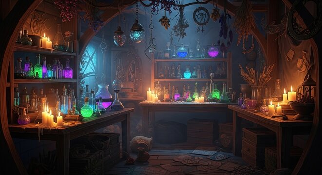 Mysterious alchemist s laboratory filled with glowing potions and candles