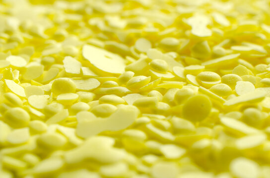 Pile of yellow sulfur granules used in medicine, fertilizers. Yellow sulfur background, texture, top view. Heap of sulfur powder, background, texture, top view.