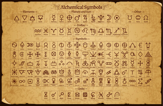Esoteric and witchcraft alchemy pentagram signs on medieval manuscript. Antique parchment with chart featuring historical symbols for elements, planets, zodiac signs, minerals and mystical concepts