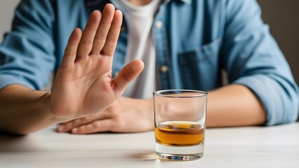 Person rejecting alcoholic drink with raised hand gesture for sober lifestyle concept