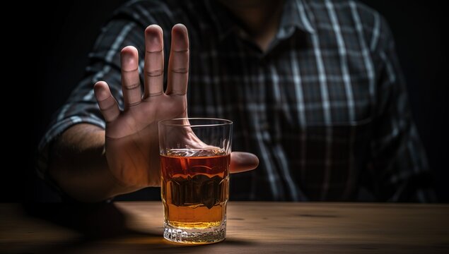 A person is refusing a glass of whiskey, symbolizing abstinence from alcohol or making a healthy choice.