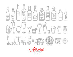 Set of 30 outline icons related to alcoholic drinks . Linear icon collection. Editable stroke. Vector illustration