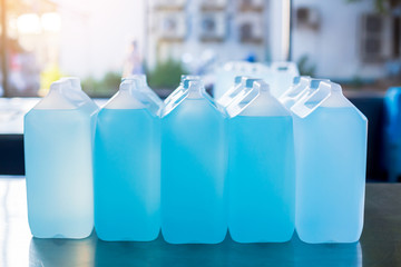 Alcohol for cleaning and sanitizing is contained in gallons in the warehouse. Many gallon alcohol gel for sanitizing Coronavirus Covid-19. Products for sale to anti Coronavirus protection (Covid 19).