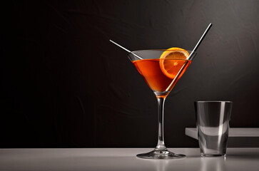 Generative AI illustration of glass with alcohol drink placed on grey against table near empty glass against black background with straw