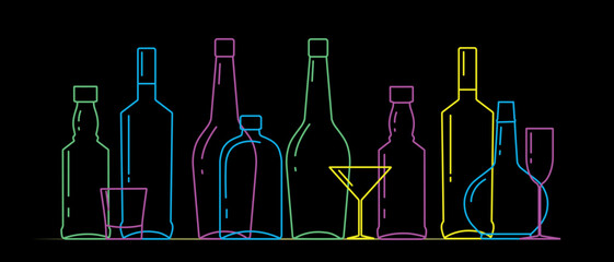 Linear neon illustration of a set of alcohol bottles. Vector drawing alcohol party