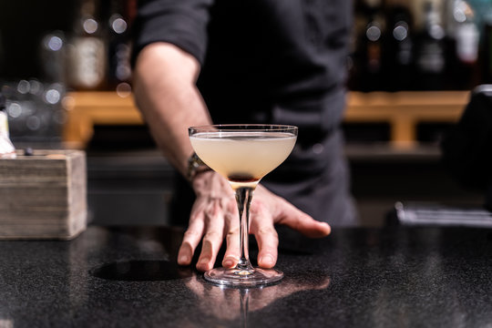 Close-up of a bartender pouring a red cocktail into a martini glass with a cherry garnish.