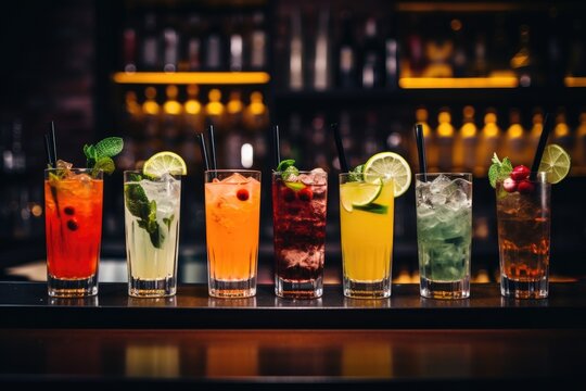 beautiful line of colorful alcoholic cocktails in a nightclub bar