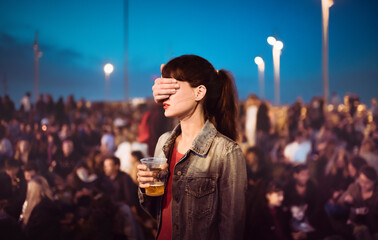 Young, sad, unhappy, helpless woman drinking alcohol. Human emotions, alcoholism and addictions
