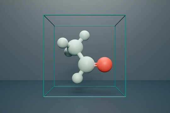 Acrolein, propenal, unsaturated aldehyde molecule. It is used as a pesticide and to make other chemicals. Structural chemical formula and molecule model.