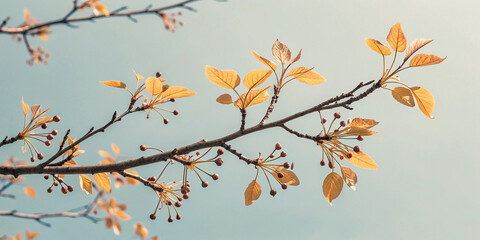 Close up of an alder branch with dried cones and leaves, creating a serene autumn atmosphere against a soft blue sky, capturing the essence of the season's transition