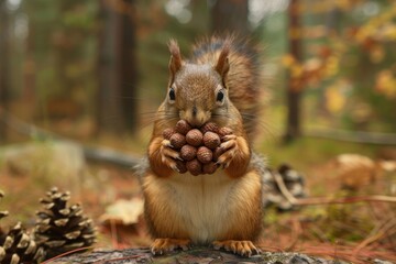Wild red squirrel gathering and holding alder cones in autumn forest