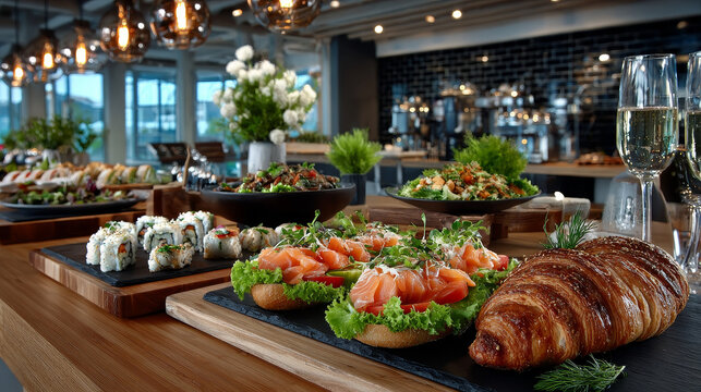 Glass of cold beer with a delicious buffet assortment of tapas or canapes on sliced baguette with savory seafood, ham and tomato toppings with fresh lettuce