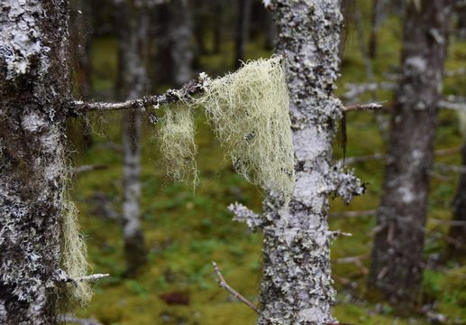 Alectoria sarmentosa witches hair old man hair on a tree in rain forest after rain damp wilderness