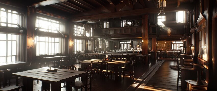 Interior medieval tavern with stone walls wooden tables and candle lights. Rustic bar scene with barrels cobblestone floor and arched doorway. Cozy vintage inn atmosphere.
